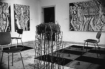 | Für diese Installationen werden orginale Materialien (objets trouvés) verwendet. Quatratische Filzfliesen mit pyramidenartigen Kleinobjekten symbolisieren ein Wohnzimmerambiente, das durch figurative Leinwanarbeiten ins Museale entrückt. Drei alte Küchenstühle beleben den Raum (Three Chairs Of Kairo - Far from good old chair-money) und symbolisieren als Metapher drei Personen und deren paralysierende Kommunkationsposition. | |||||