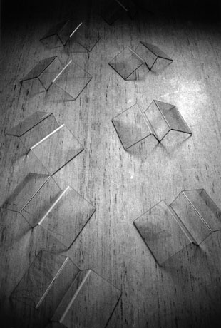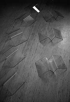 Mit Glasfragmenten werden Vogelpiktogramme auf einem Industrielinoleumboden platziert. Die Symbolik einer raumgreifenden dreidimensionalen Fortbewegungen (Fliegen) wird negiert und Retardation (Walking) bestimmt das Geschehen. |